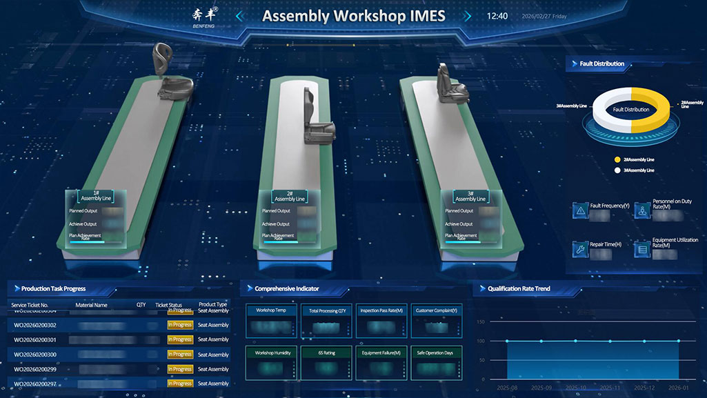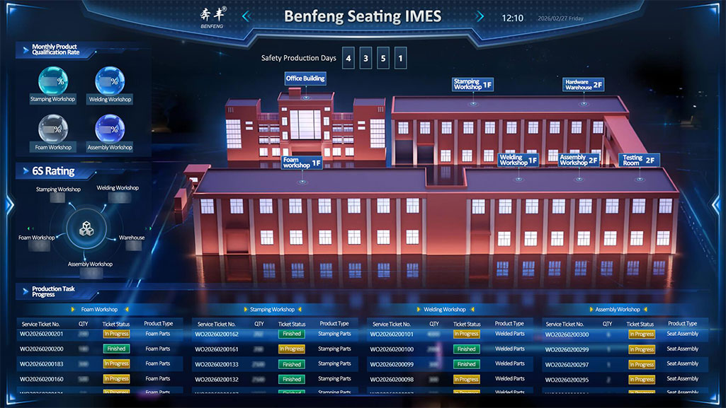 في النظام البيئي الرقمي لـ Benfeng Seats IMES، تصبح ورشة التجميع، مع إدارتها الذكية للعملية الكاملة، بمثابة أرض الاختبار النهائي لجودة المقاعد النهائية.