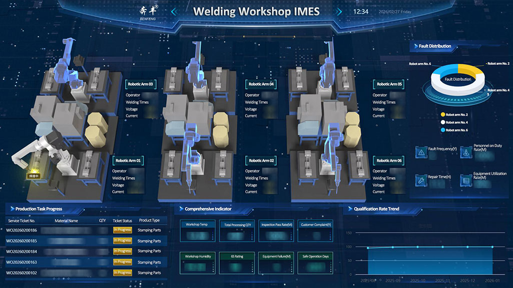 من خلال تقنية التصور ثلاثي الأبعاد، تعرض ورشة العمل بوضوح التشغيل التعاوني لأذرع آلية اللحام الذكية المتعددة. تم تجهيز كل ذراع آلي بمشغل مخصص ووحدة مراقبة المعلمات (الجهد والتيار وعدد اللحام وما إلى ذلك)، مما يحقق عملية لحام دقيقة ويمكن التحكم فيها. وفي الوقت نفسه، يقوم بمراقبة المؤشرات الرئيسية مثل درجة الحرارة والرطوبة وعدد عمليات اللحام يوميًا في الوقت الفعلي، مما يضمن جودة اللحام من جميع الأبعاد، من البيئة إلى العملية.